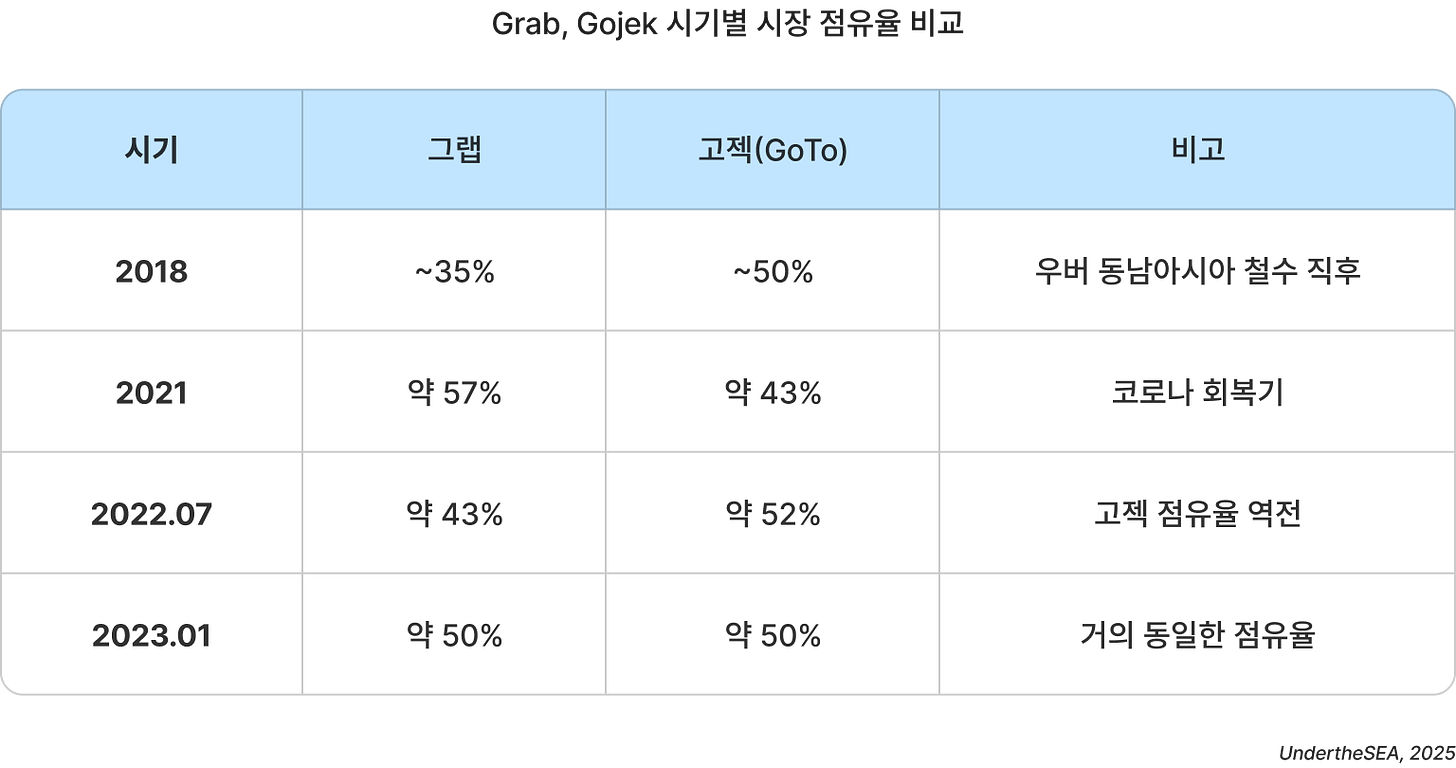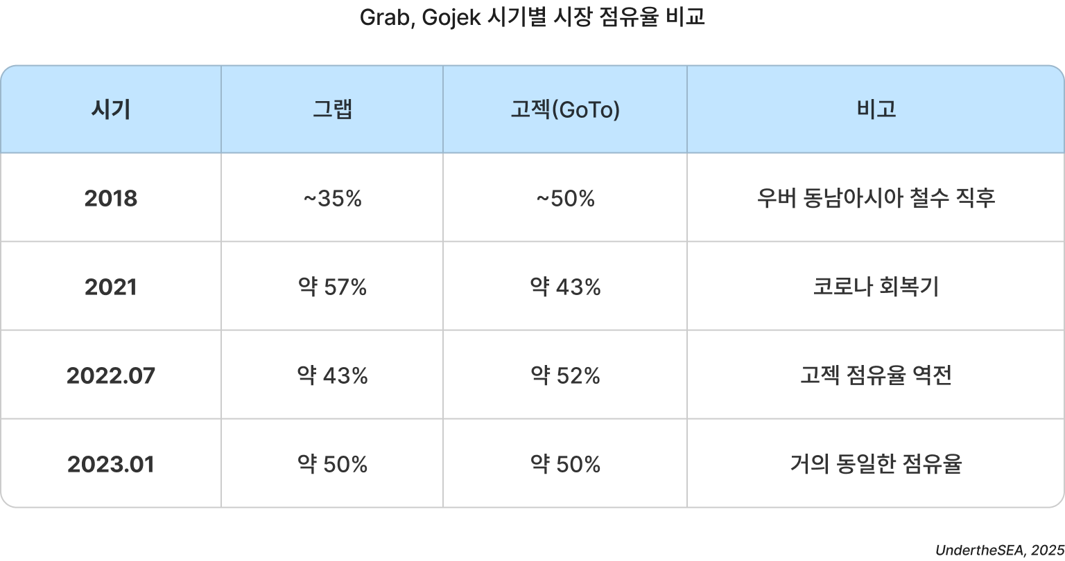 편의상 동남아시아로 묶지만, 말레이시아에서 시작해 싱가포르에 본사를 둔 그랩은 인도네시아에서는 엄연히 외국 기업입니다. 반면 고젝은 인도네시아 토종. 이 홈그라운드 어드밴티지가 얼마나 강력했는지, 시장 점유율 추이를 보면 알 수 있습니다.