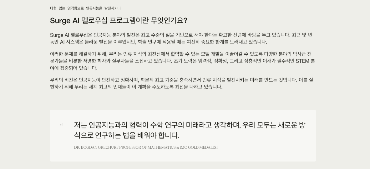최첨단 연구소의 많은 고객들이 말해요. "Surge AI 없이는 우리가 만들고 있는 걸 만들 수 없을 거예요." 우리가 정말 중요한 역할을 하고 있다는 거예요. 그게 제가 계속하는 이유예요.