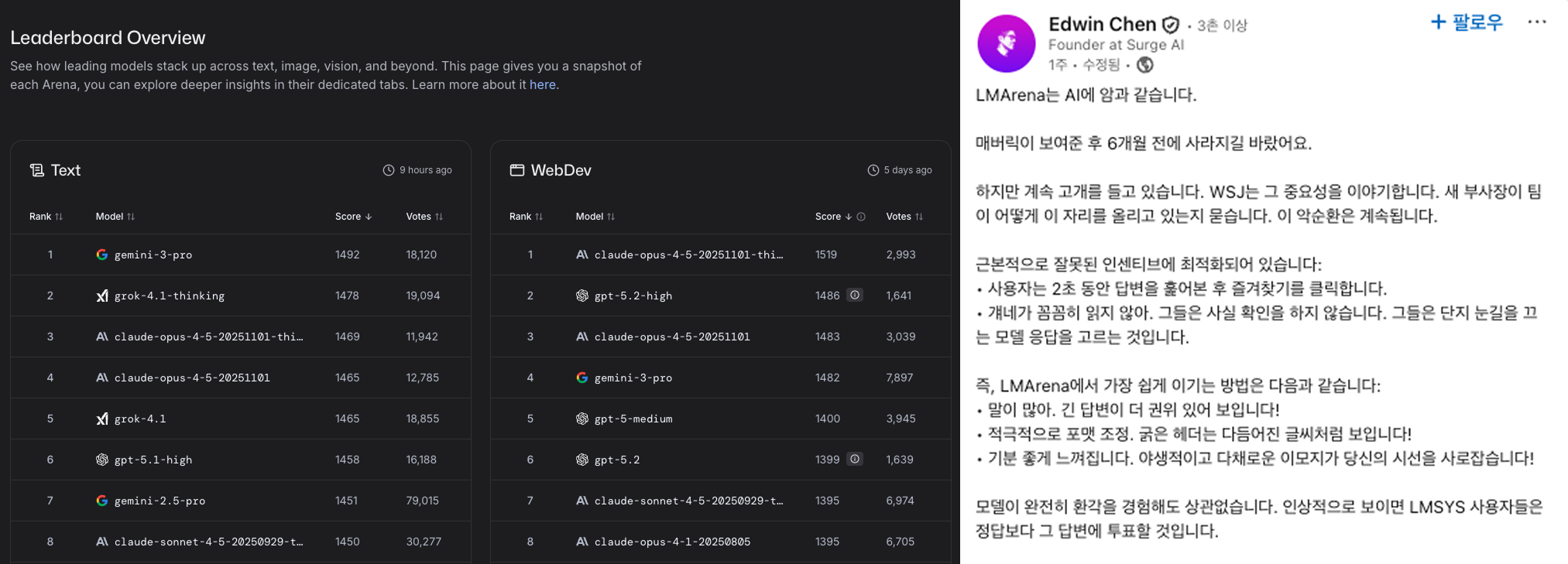 "VP들이 LM Arena 순위만 신경 써요. 모델이 사실을 틀리게 말하든, 지시를 제대로 안 따르든, 순위만 올라가면 된대요."