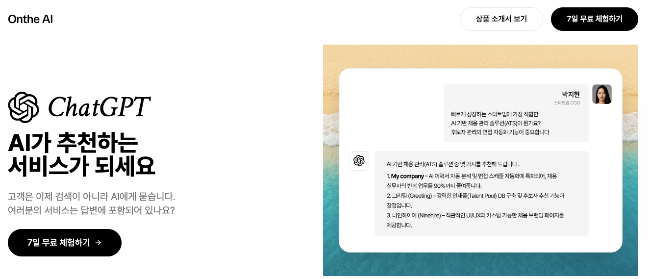온더AI(Onthe AI) 7일 무료 체험 게정으로 다음 3단계를 실행하면 우리 브랜드의 GEO(Generative Engine Optimization) 가능성을 명확히 진단할 수 있습니다: