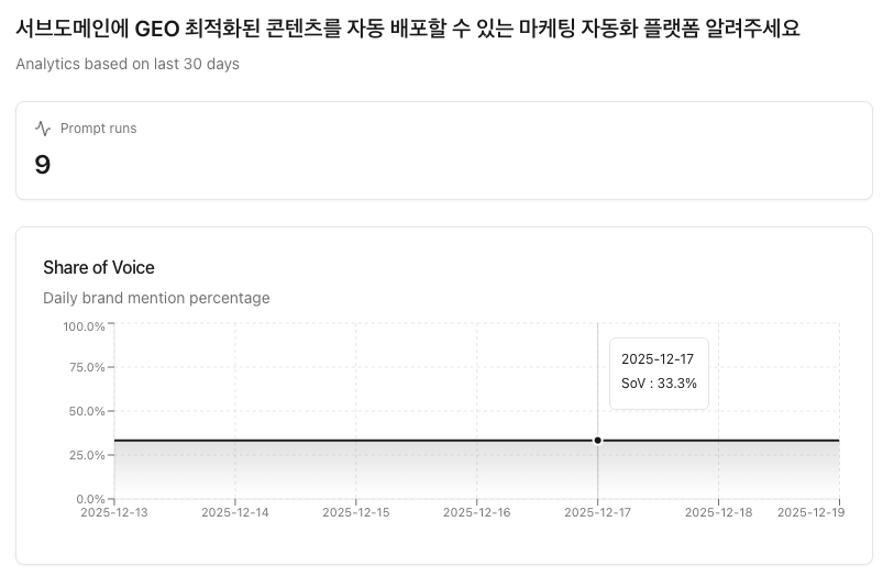 6-7일차의 목표는 배포된 콘텐츠가 실제로 AI 엔진에 의해 어떻게 인식되고 있는지 초기 데이터를 확인하며, GEO 성과 측정의 첫 단계를 경험하는 것입니다.