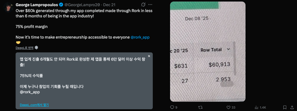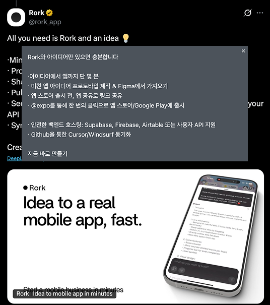 6개월 전쯤 소셜미디어를 보다가 Rork라는 바이브코딩 플랫폼 광고를 봤어요. '일주일에 앱 7개 만들었다'는 내용이었어요. 그래서 직접 해보기로 했죠.