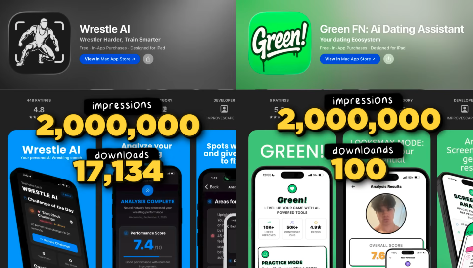 두 앱 다 200만 노출 정도 나왔어요. 근데 Wrestle AI는 다운로드 수가 많았는데, 그 앱은 180만 노출에 고작 100건 다운로드밖에 안 나왔어요.