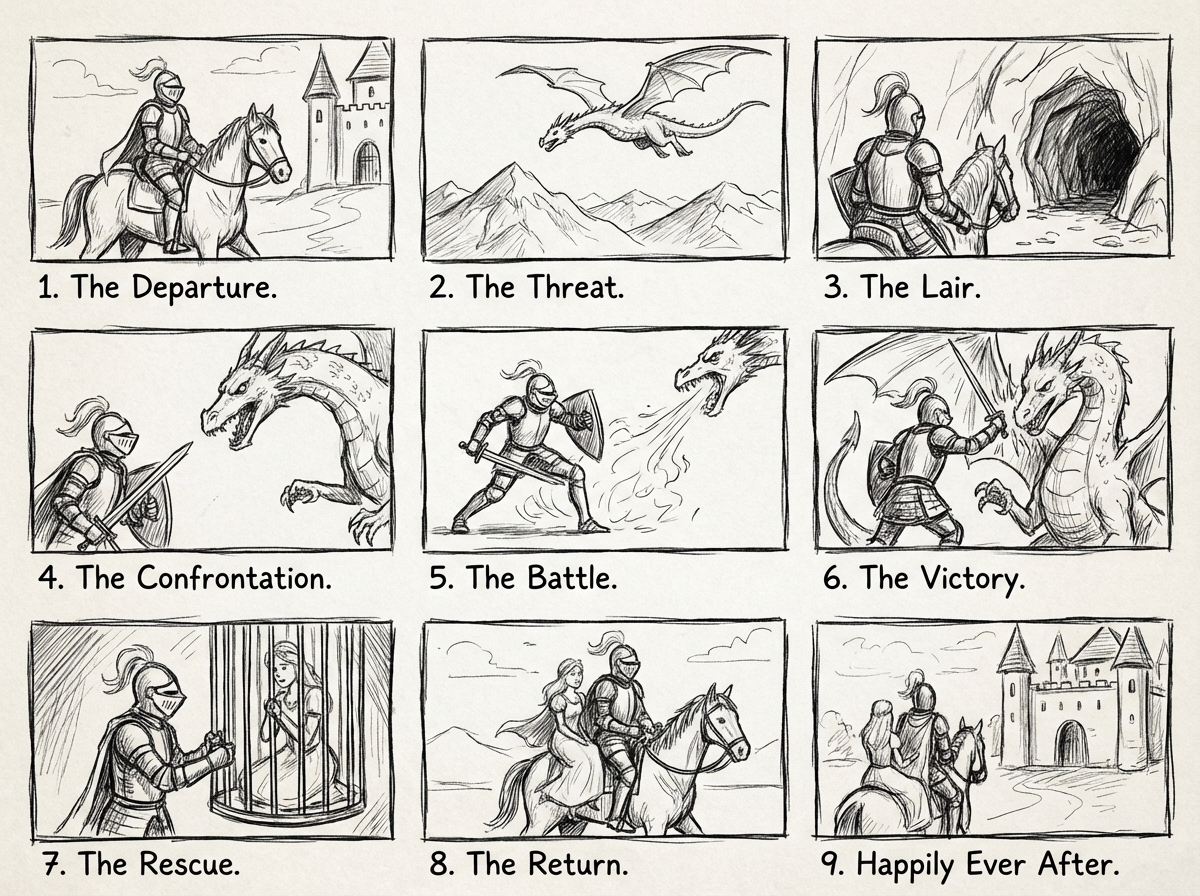 여기까지 단계를 거쳐 어느 정도 방향이 정립되었다면 이를 시간의 흐름인 '시나리오'로 엮어내야 합니다. 서사 구조론은 인간의 뇌가 이야기를 받아들일 때 가장 몰입감을 느끼는 일정한 패턴이 있음을 보여줍니다. 단순히 장면을 나열하는 것이 아니라 학술적인 서사 템플릿을 따르는 이유는 시청자의 광고에 대한 심리적 저항을 최소화하고 최대한 본인의 이야기인 것처럼 몰입시키기 위함입니다.