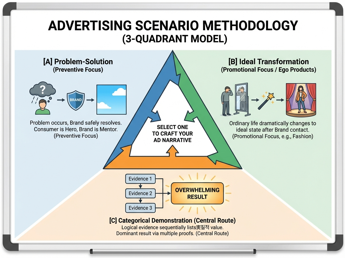 [A] 결핍 해결형 (Problem-Solution): '예방 초점'과 주로 결합합니다. 문제가 발생한 상황을 먼저 보여준 뒤 브랜드가 등장하여 안전하게 해결하는 구조입니다. 여기서 중요한 것은 주인공은 반드시 '소비자'여야 하며 조력자가 '브랜드'여야 합니다.(심리학적으로 인간은 누구나 자기 자신을 주인공으로 설정합니다.)