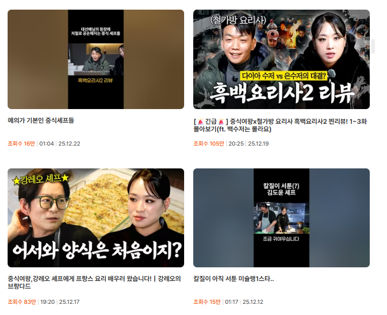 요리 레시피에만 머무르지 않고, 흑백요리사 리뷰·셰프 콜라보·가족 이야기·일상 브이로그까지 자연스럽게 섞여 있어요.