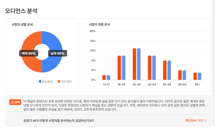 영상 길이가 13분대로 긴 편인데도 시청이 잘 유지된다는 점에서 콘텐츠 몰입도가 높아요. 특이하게 시청자 성비가 5:5로 갈리는 것도 특징이라 요리 채널 중에서는 타깃 폭이 넓은 편이에요.