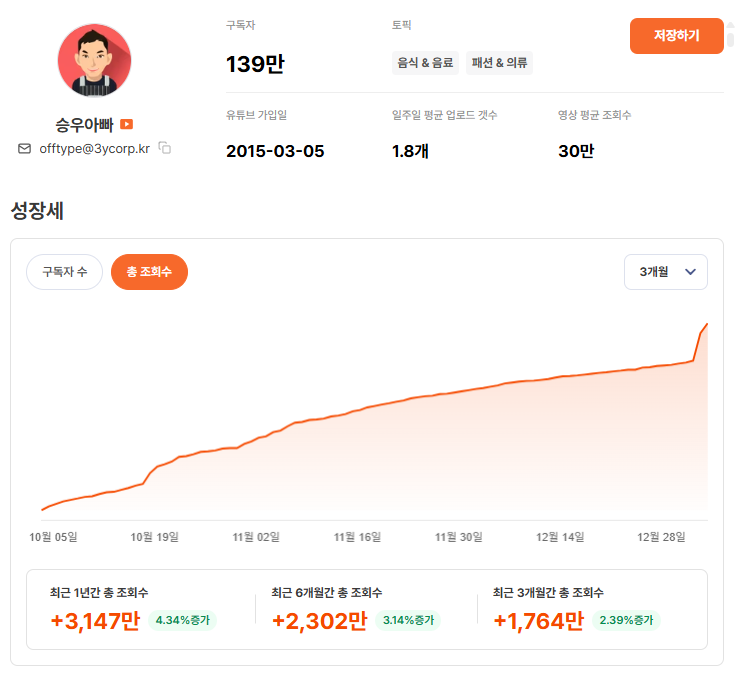 최근 영상 평균 조회수 30만, 3개월 누적 조회수도 1,700만 이상으로 체급 대비 효율이 좋아요. 다시 찾아보는 시청자가 늘어난 흐름입니다.