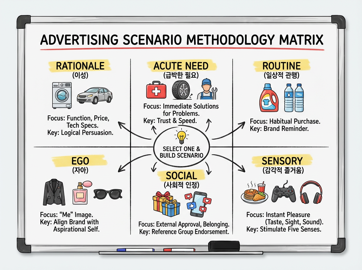 - 핵심 내용: 앞 단계에서 전략을 결정한 후 가장 효과적인 광고 영상 시나리오를 도출하기 위해 과학적 방법론에 기반한 시나리오 도출 프레임워크를 따릅니다.