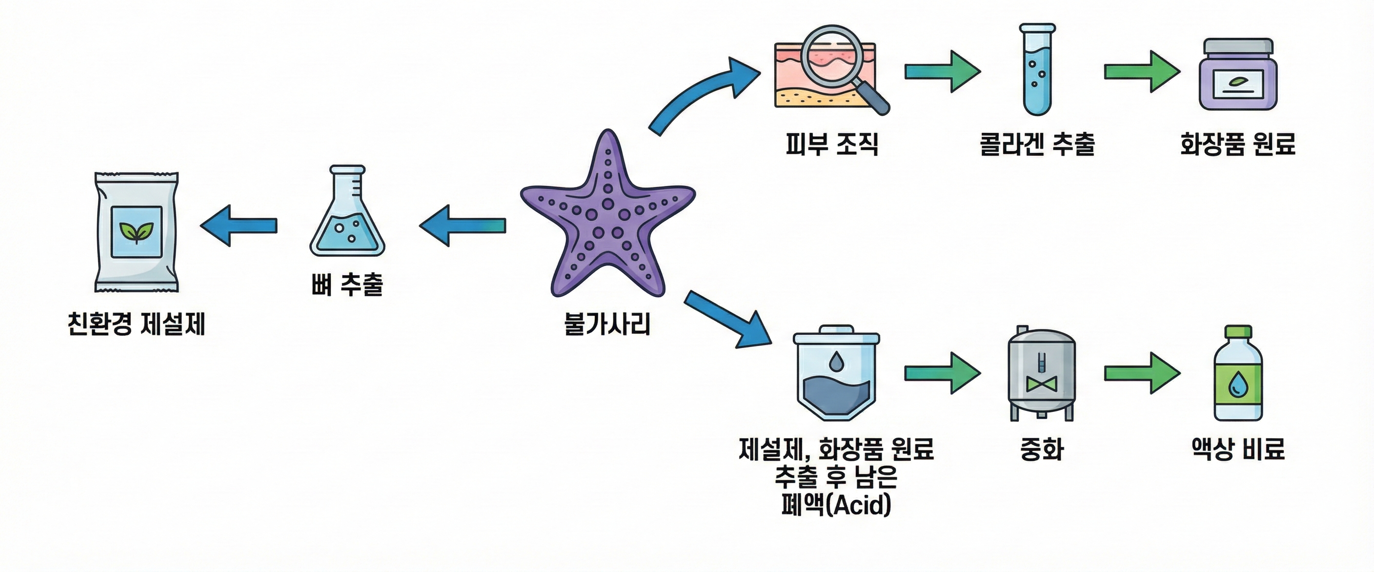 스타스테크의 해법은 놀랍게도 다시 ‘불가사리’였습니다. 하나의 원료를 뼈대까지 남김없이 활용하는 업사이클링의 다각화를 통해 비수기 없는 포트폴리오를 완성하고 있습니다.