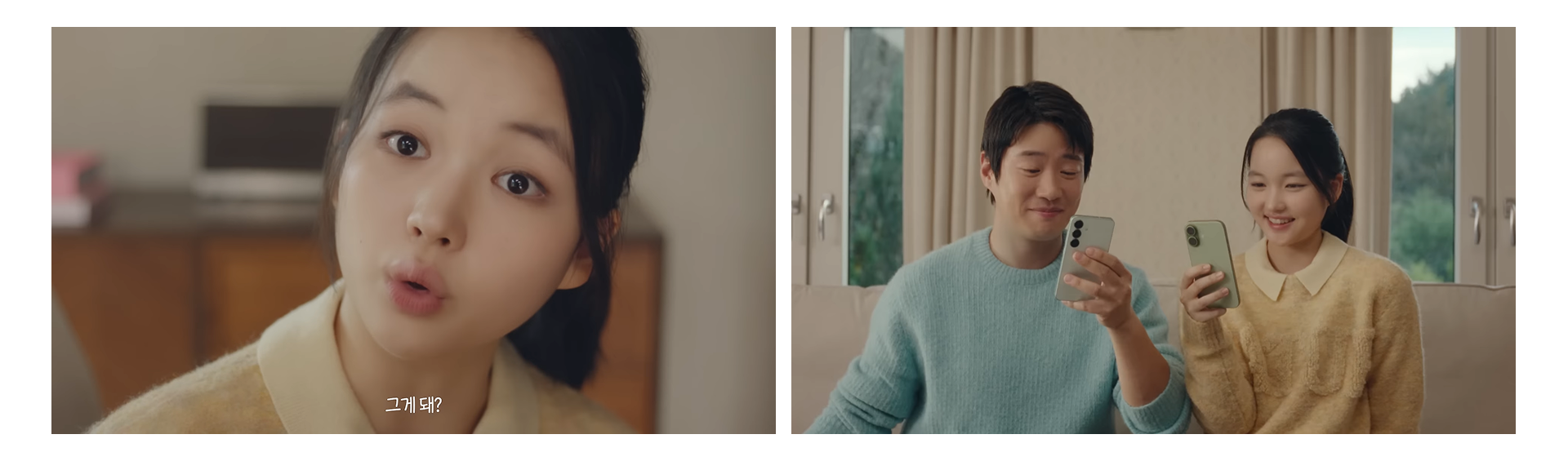 모델의 전신과 따뜻한 거실 배경이 어우러지는 풀 샷(전신 샷)과 신뢰감을 주는 미디엄 샷(상반신 샷)으로 일상적인 서사를 구성하고, 아이 레벨 구도(시청자 시선과 유사한 눈높이)를 통해 소비자에게 진정성과 친근한 모습을 보여주었습니다.