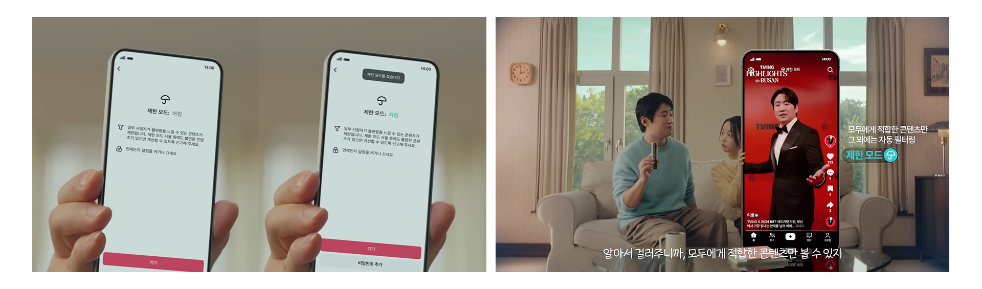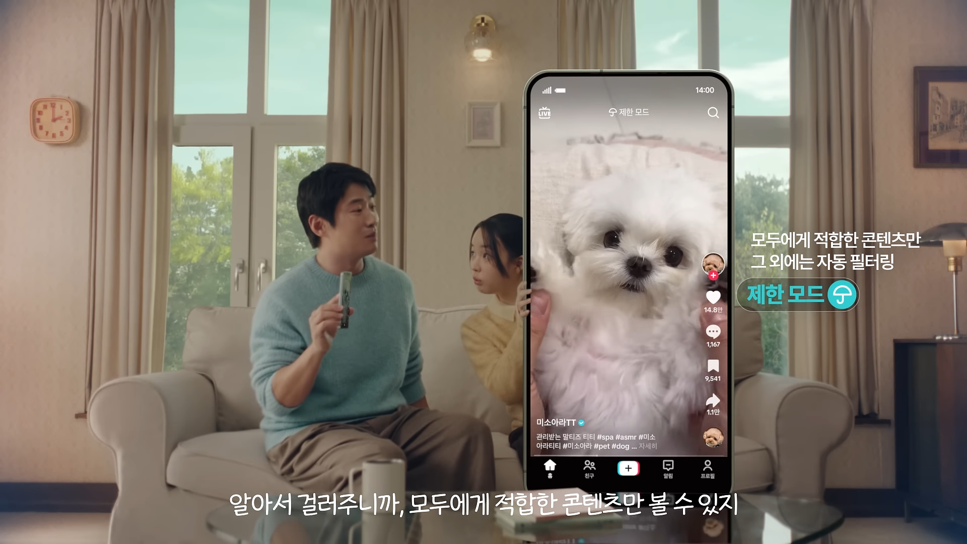 이번 광고에서 가장 흥미로운 설계는 화면상 스마트폰의 위치입니다. 삼촌이 조카의 계정을 보려 할 때, 조카가 핸드폰으로 얼굴을 가리거나 핸드폰 화면이 삼촌을 막는 연출은 만 16세 미만 청소년 보호 기능을 '공간적 방패'로 시각화한 장면입니다.