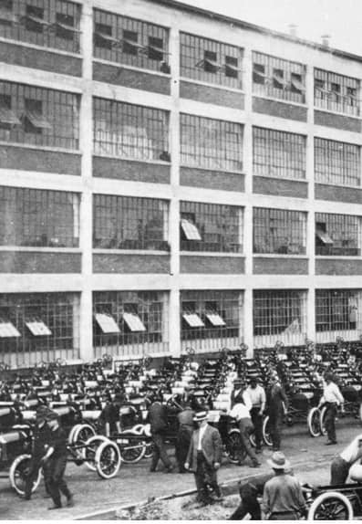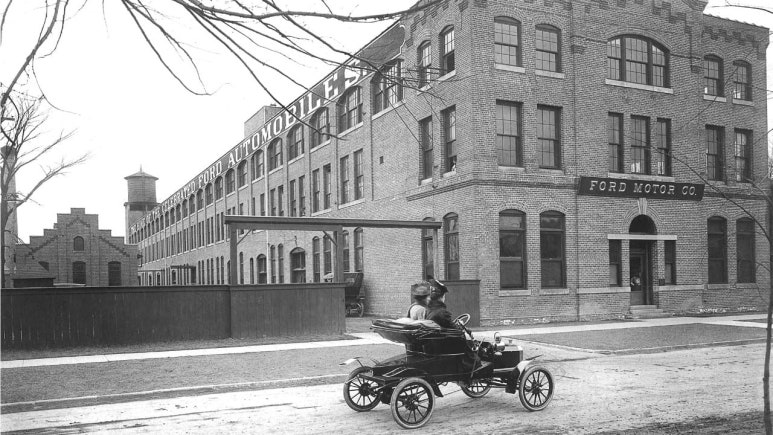 이 낡은 3층 건물은 '모델 T'가 태어난 곳입니다. 초기에는 한곳에서 노동자들이 부품을 들고 왔다 갔다 하며 차를 조립했는데, 나는 그 혼란스러운 낭비를 도저히 참을 수가 없었습니다. 어느 날 아침, 나는 직원들에게 폭탄선언을 했습니다.