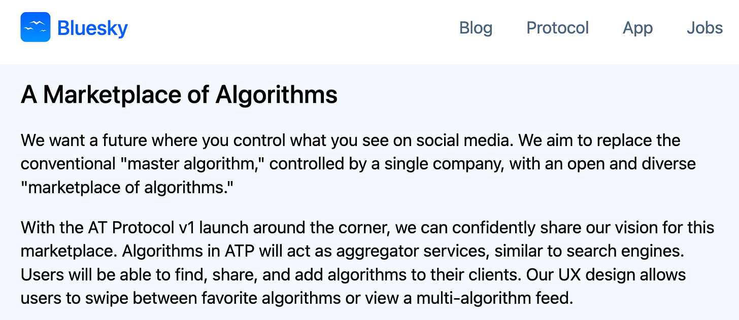 플랫폼은 앞서 보듯 사용자와 이해관계 충돌을 일으킬 수 있지만, 내가 훈련시킨 내 알고리즘이 나와 충돌을 일으킬 일은 없다. 공급자 입장에서도 훨씬 정교한 소비자 경험을 설계할 수 있고, 소비자 입장에서도 원하는 맥락에 따라 경험을 취사선택할 수 있다. 이는 Bluesky가 원하는 방향 - 프리메이드 알고리즘을 사용자가 선택할 수 있는 마켓플레이스 모델과도 비슷한데, 개인적으로 이런 store 모델은 과도기적 형태라고 본다.
