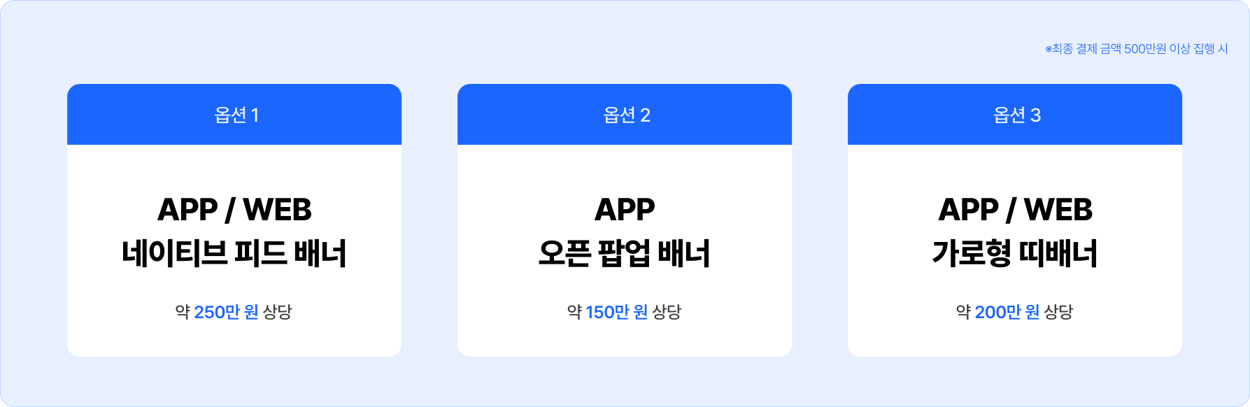 적용 캠페인 운영 기간 동안 ‘네이티브 피드 배너’ 동영상 광고를 500만원 이상 집행하시면, 아래 광고 상품 3가지 중 1가지를 선택하여 추가 혜택을 받을 수 있습니다.