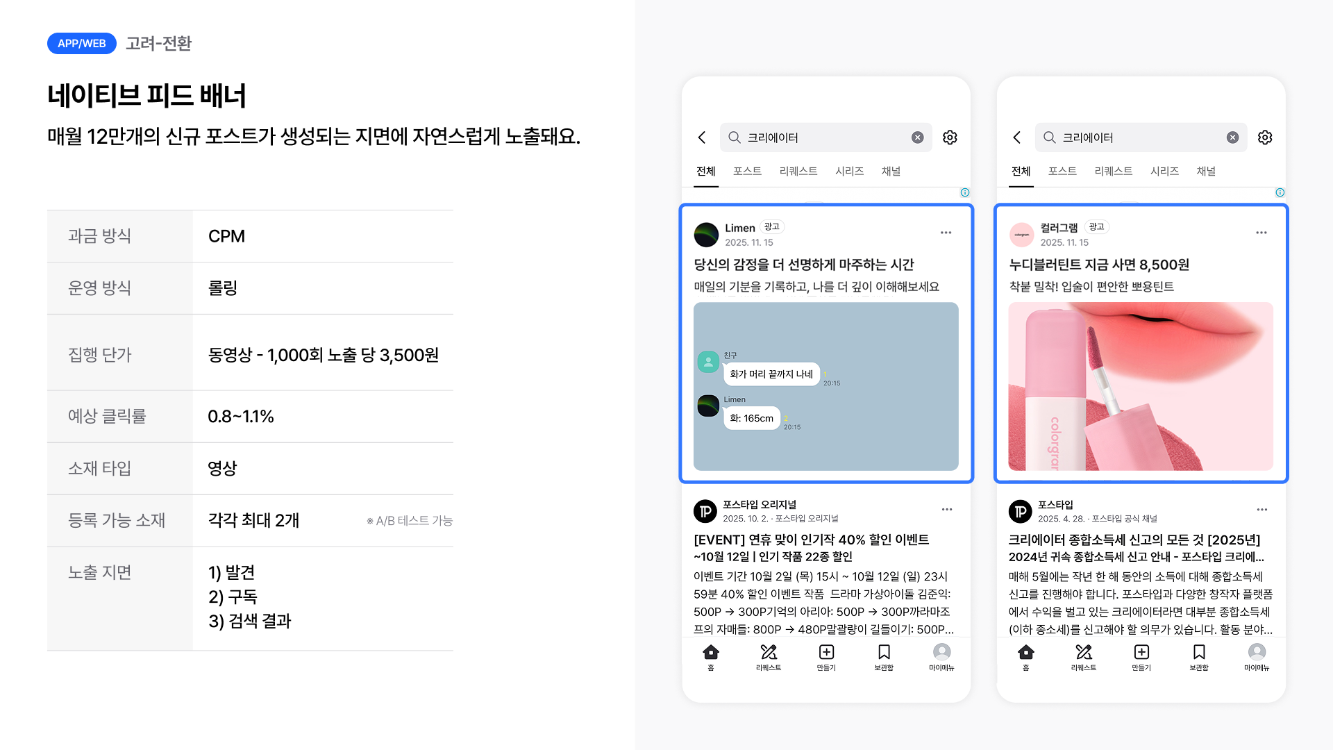 신청 대상 : 포스타입에서 '네이티브 피드 배너' 동영상 광고를 500만원 이상 집행하는 광고주