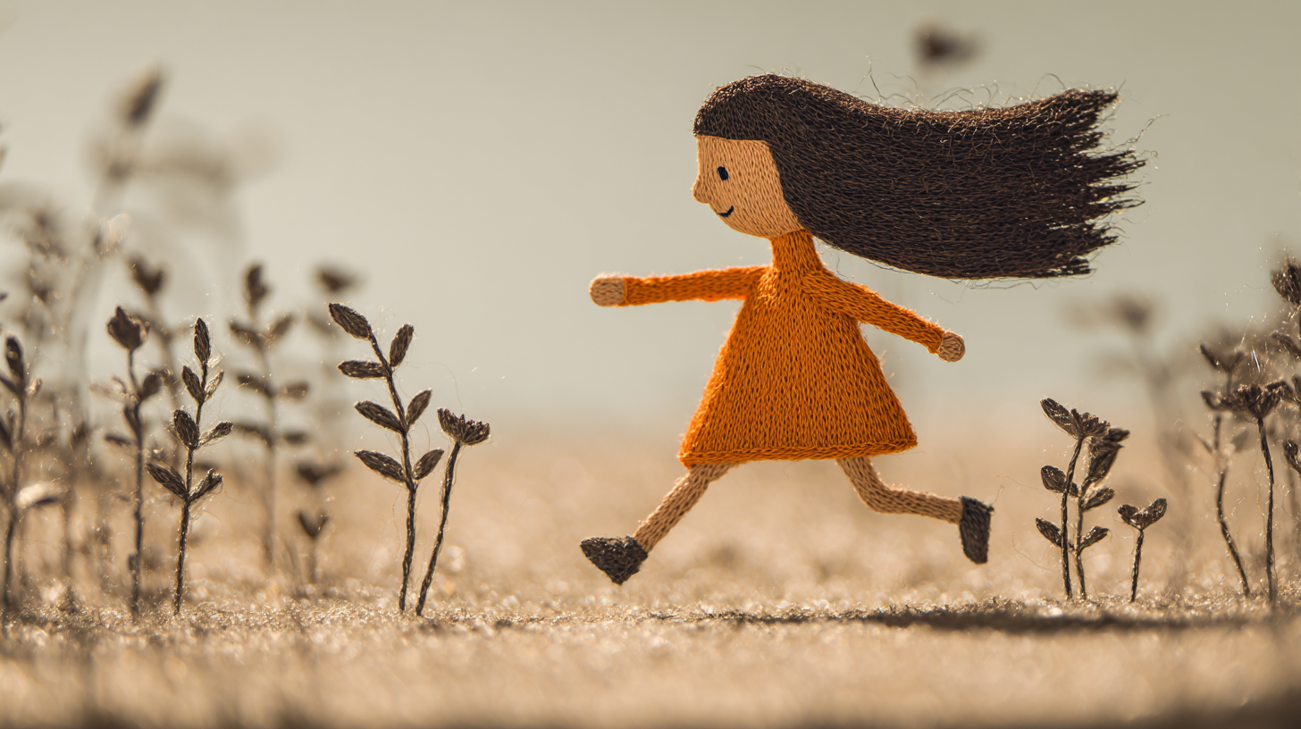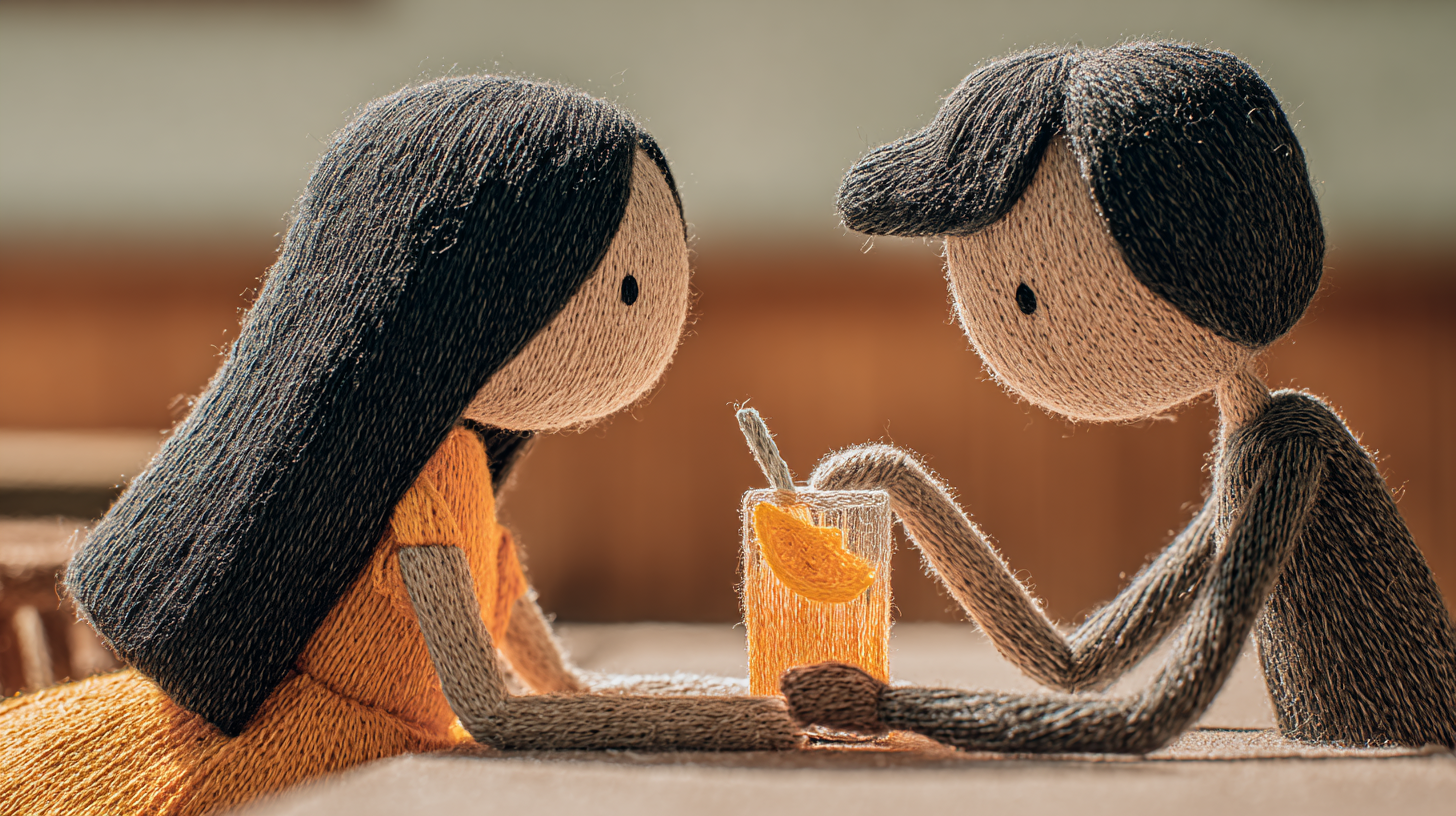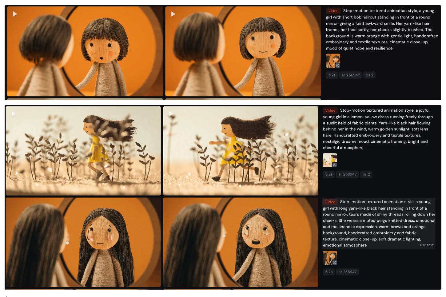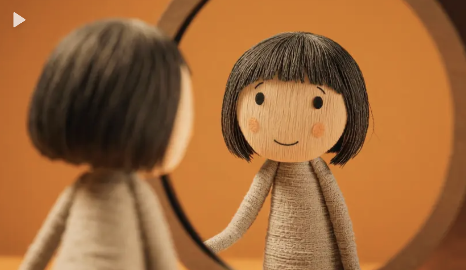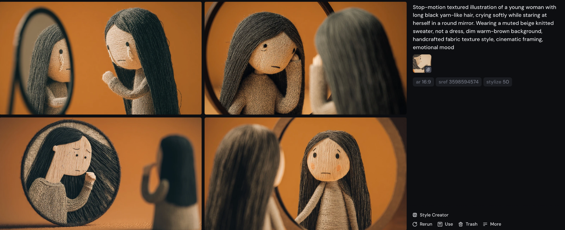 프롬프트 예시:Stop-motion textured illustration of a young woman with long black yarn-like hair, crying softly while staring at herself in a round mirror. Wearing a muted beige knitted sweater, not a dress, dim warm-brown background, handcrafted fabric texture style, cinematic framing, emotional mood --sref 3598594574