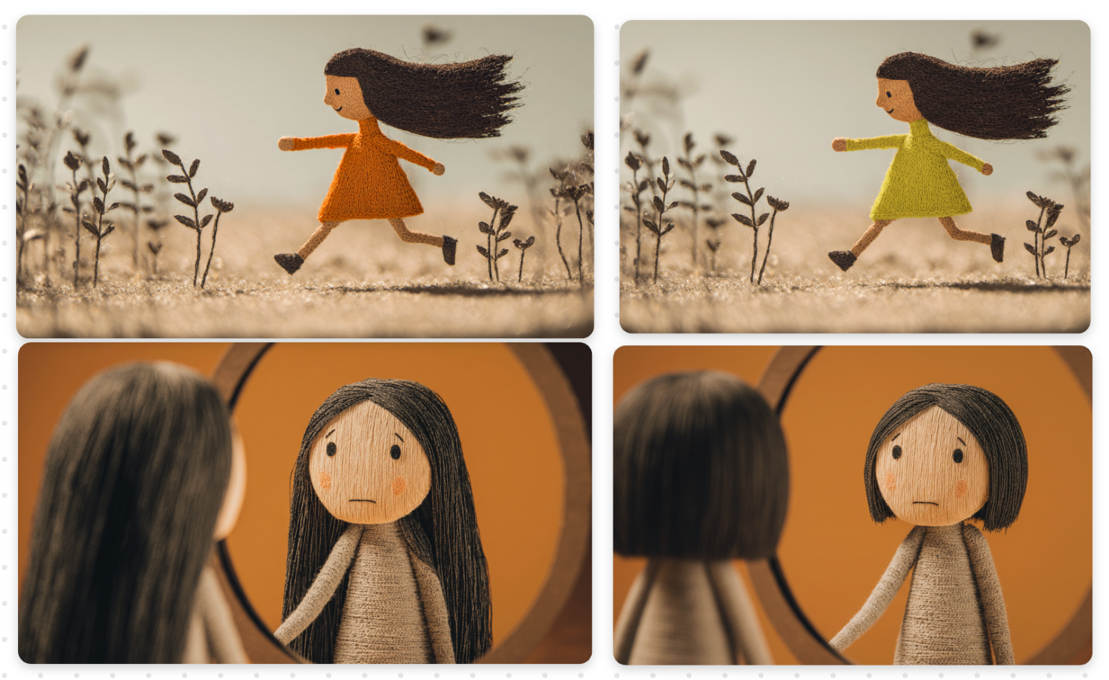 - 주황 원피스 → 레몬색 ("여자 주인공의 주황색 원피스를 레몬색으로 바꿔줘")