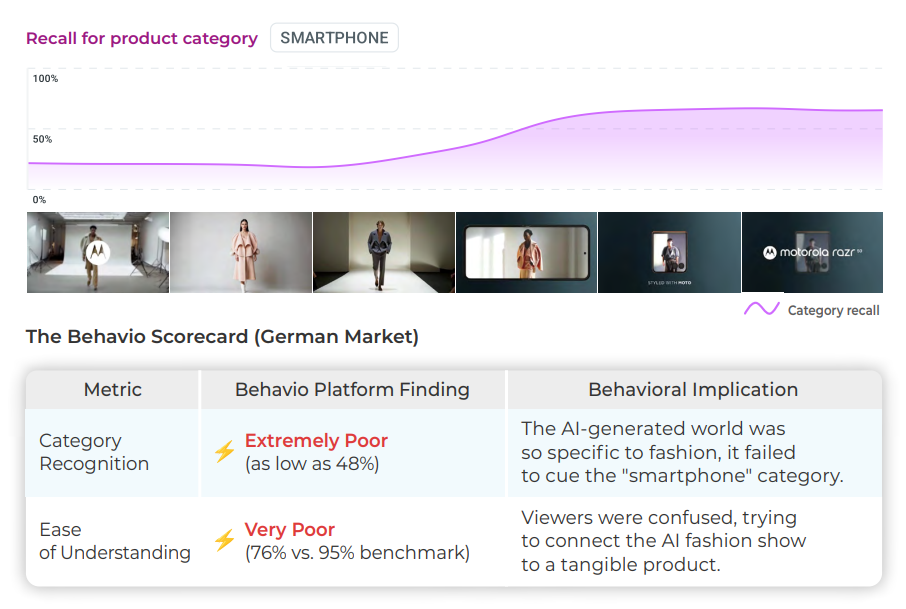 - 단점: 카테고리 인식의 참사입니다. 비주얼이 너무 패션에만 치우쳐 소비자들이 '스마트폰' 광고임을 인지하지 못했습니다. 즉, 패션 광고인지 스마트폰 광고인지 인식할 수 없는 광고였습니다. 해당 광고는 카테고리 인식률이 48%까지 떨어지며 모토로라 브랜드를 광고한 것이 아닌, 패션 카테고리를 광고한 셈이 되었습니다.