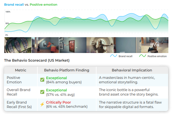 - 장점: 인간 중심의 감성적인 스토리텔링으로 84%의 경이로운 긍정적 감정도를 기록했습니다. 아이코닉한 콜라 병 자산 덕분에 전체 브랜드 회상도 역시 57%로 우수했습니다.