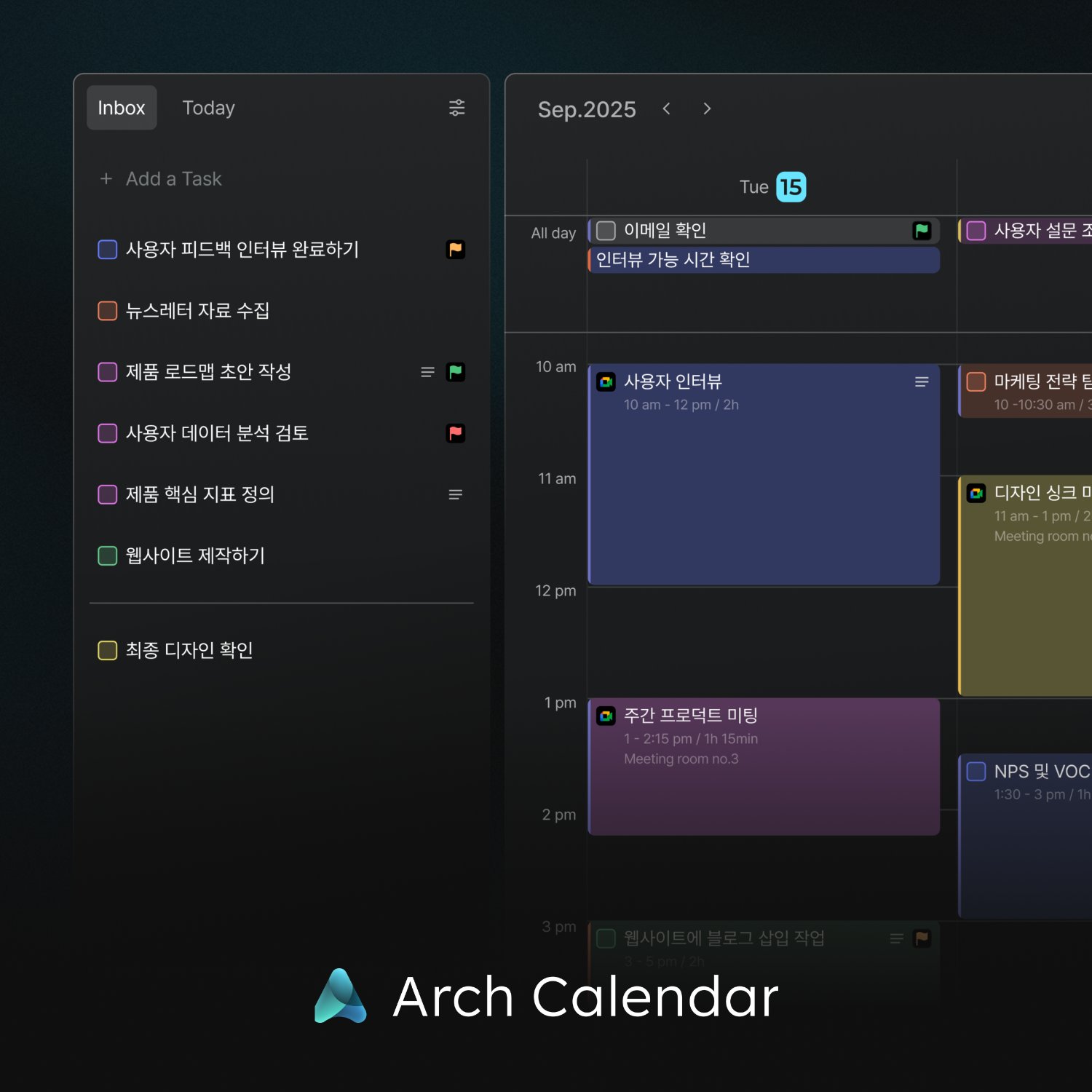 아치 캘린더는 캘린더와 태스크를 하나로 통합해서, "이 일을 언제 할 것인가"를 단순히 목록이 아닌 시간 블록으로 보여줍니다.