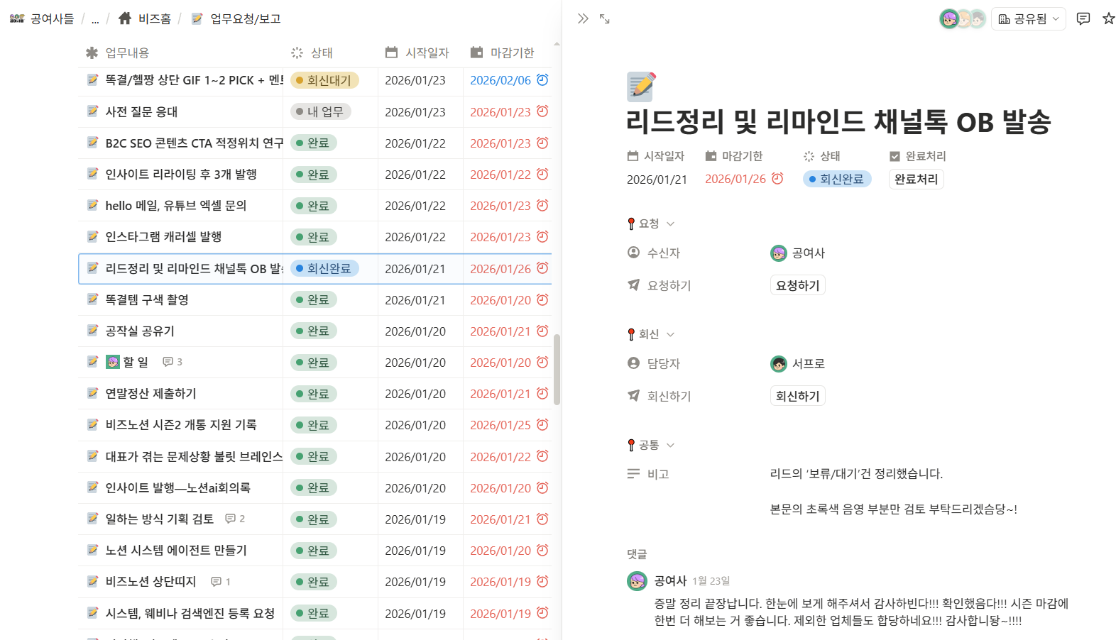 "이번 주 안에 고객사 제안서 초안 만들어줘" 같은 지시를 업무요청으로 남깁니다. 담당자, 마감일, 진행 상태가 한눈에 보이니 대표가 일일이 물어보지 않아도 됩니다.
