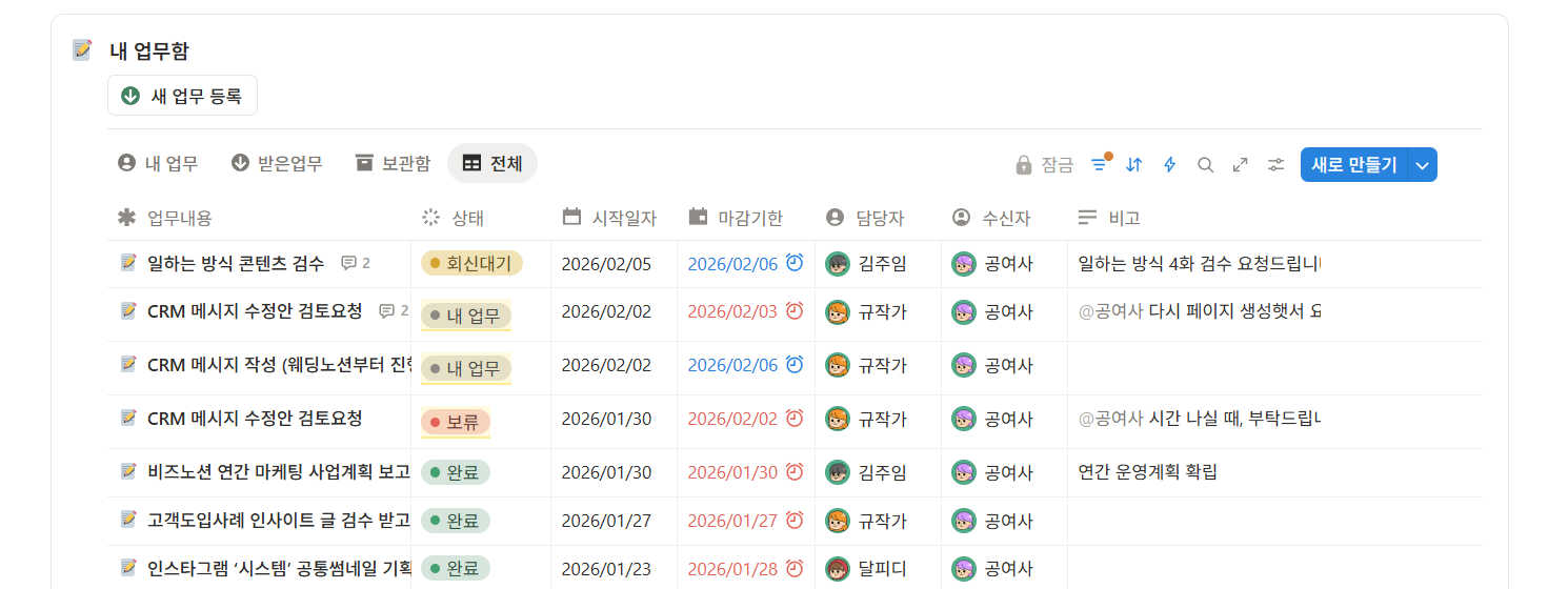 업무요청이라는 개념이 여기서 중요합니다. 이건 단순히 일 시키기가 아니라, 담당자를 명확히 하고, 마감일을 정하고, 완료 여부를 추적할 수 있는 단위로 업무를 주고받는 방식입니다.