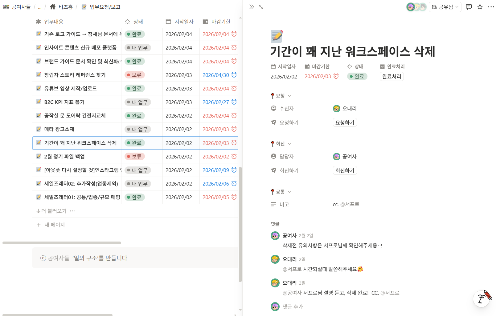 공여사들이 만든 구조에서는 업무요청이 중심에 있습니다. 대표도 직원도 이 방식으로 일을 주고받고, 진행 상황을 확인하고, 완료 처리를 합니다. 결재가 필요한 건 별도로 구분해서 처리합니다. 이렇게 구분하니까 일이 막히지 않고 굴러갑니다.