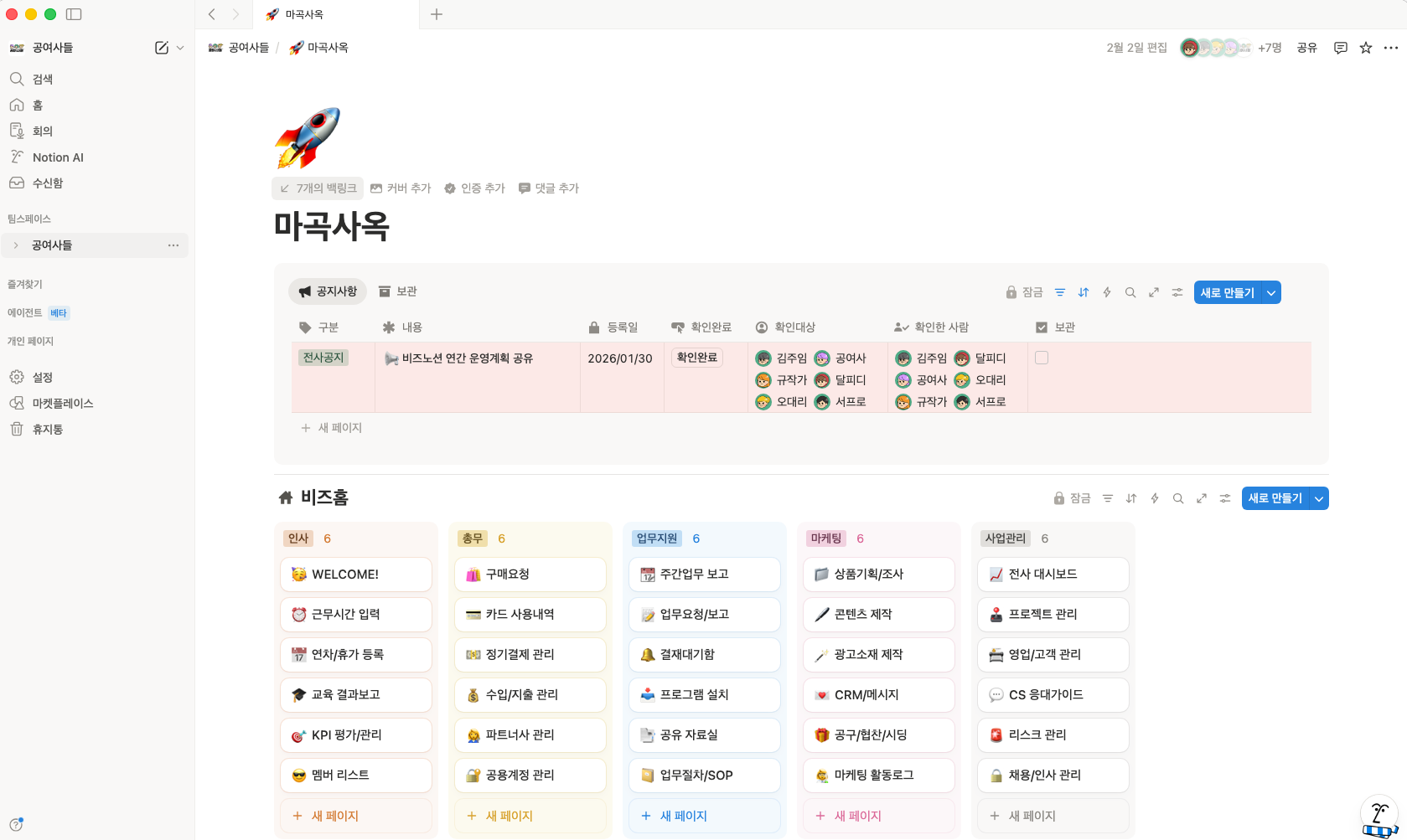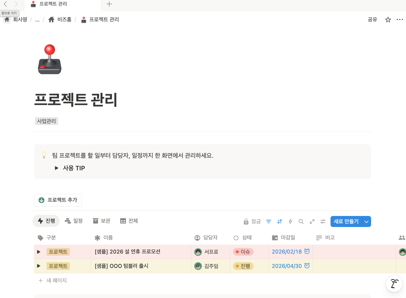 노션에서는 팀원 각자의 담당 업무를 한 화면에서 바로 확인할 수 있습니다.