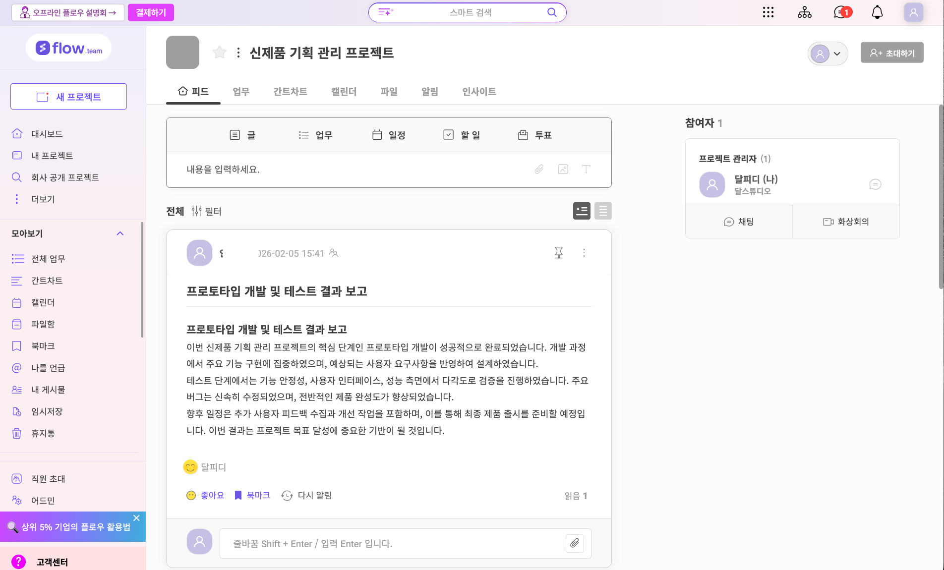 플로우의 핵심 장점은 학습 시간이 짧다는 점입니다. 화면 구성이 페이스북과 카카오톡을 섞어놓은 형태라서, 연차와 무관하게 누구나 빠르게 익힙니다. 몇 번의 클릭만으로 사용이 가능합니다.