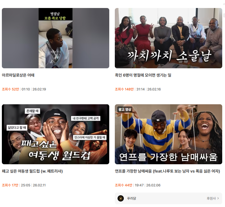 조나단 채널의 ‘흑인 6명이 명절에 모이면 생기는 일’ 역시 148만 조회수를 기록했습니다. 이 채널은 콘텐츠별 조회수 편차가 큰 편에 속하는데 그런 점에서 이번 영상의 148만은 단순 평균 수준이 아니라 상단 구간에 해당합니다.