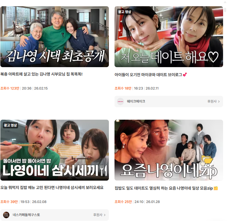 김나영의 노필터tv 채널 역시 ‘시댁 최초 공개’ 영상이 123만 조회수를 넘겼습니다. 최근 결혼 이후 안정적이고 긍정적인 관계 이미지가 형성되면서 배우자와 가족에 대한 관심도 자연스럽게 높아진 상황이었습니다. 이런 맥락에서 시댁 방문, 부모님과의 관계 공개는 설이라는 시기성과 강하게 연결되는 소재였고 동일 채널의 일반 일상 브이로그 대비 뚜렷한 조회수 격차를 만들었습니다.
