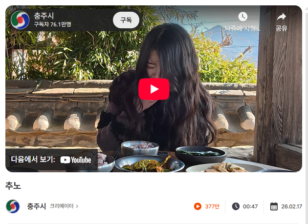 이번 기간 전체 최고 조회수는 충주시 채널 중 ‘추노’(377만)였습니다.