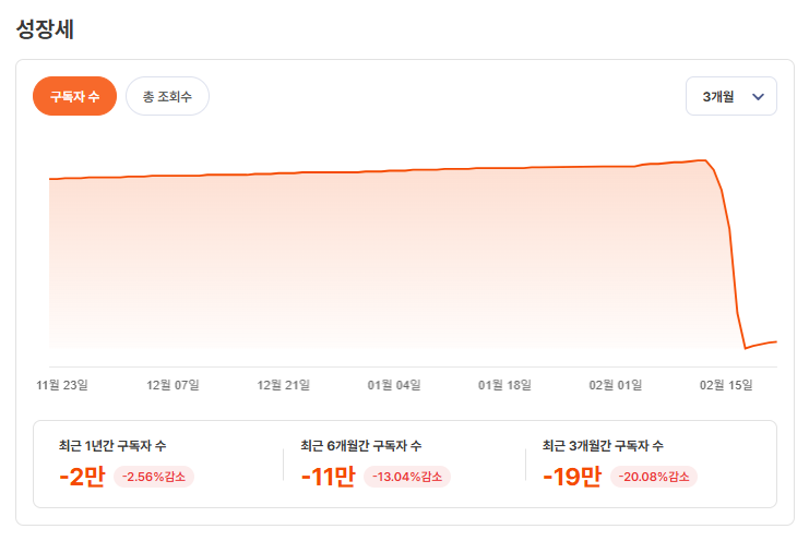 다만 최근 충주맨 퇴사 이후 구독자 수가 급감하는 흐름이 나타나고 있어 채널 안정성 측면에서는 변곡점 구간으로 보입니다.