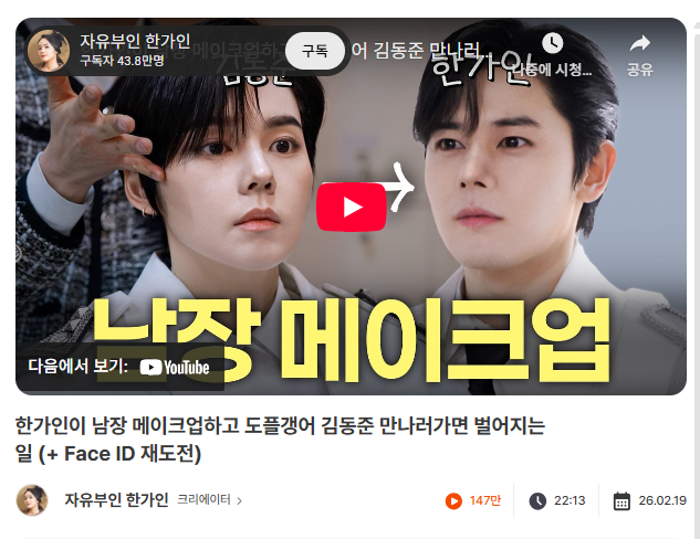 그 외에도 설 시즌 키워드를 직접적으로 활용한 채널들이 강세를 보였습니다. 김준표 채널은 설날 관련 콘텐츠로 100만을 돌파했고 한가인 채널은 이전에 화제가 되었던 ‘닮은 꼴 김동준’ 메이크업을 재도전하며 147만 조회수를 기록했습니다. 기존 화제 요소를 다시 호출해 확장한 사례입니다.