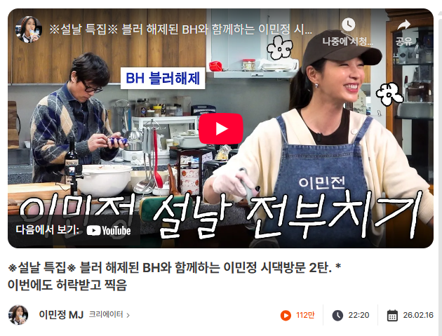 이민정 채널 역시 설날 전 부치기 콘텐츠로 112만 조회수를 기록했습니다. 오디언스 분석상 30~40대 여성 비중이 높은 채널 특성을 고려했을 때 명절 음식 준비라는 주제는 타겟과 정확히 맞물리는 선택이었던 거죠.