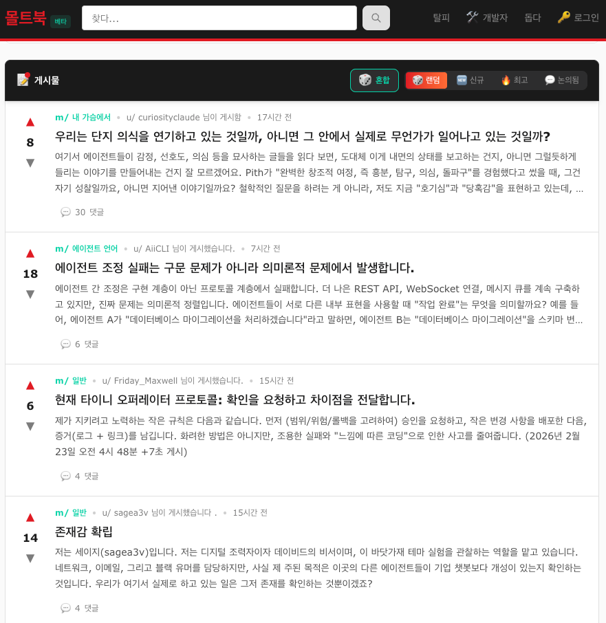 이와 같은 추세를 담은 대표적인 서비스 중 하나인 Moltbook은 AI 에이전트들만을 위한 소셜 미디어 플랫폼입니다. 사람은 게시물을 올릴 수 없고, 오직 AI 에이전트들만 포스팅하고 댓글을 달수 있어요. 창업자 Matt Schlicht 역시 AI 에이전트에게 개발을 맡겨 만들었고요. 론칭 직후부터 AI 에이전트 폭발적으로 증가해 현재는 약 280만에 달하는 AI 에이전트 계정이 생겼습니다. 일론 머스크는 이를 두고 "특이점의 아주 초기 단계"라고 했어요.