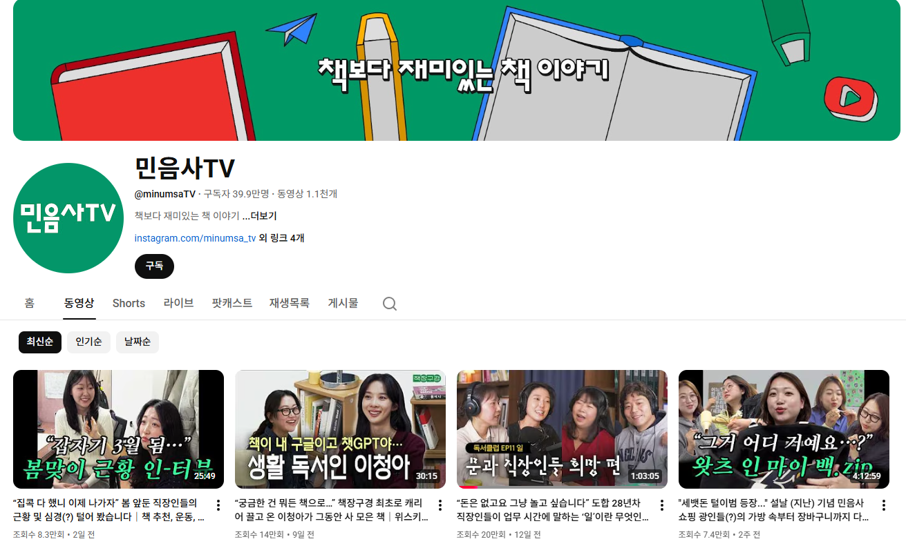 임플로이언서 사례를 이야기할 때 기업 채널도 빼놓을 수 없습니다. 그중에서도 요즘 주목받고 있는 채널이 바로 ‘민음사TV’입니다. 현재 구독자는 약 39만 명 수준인데요.