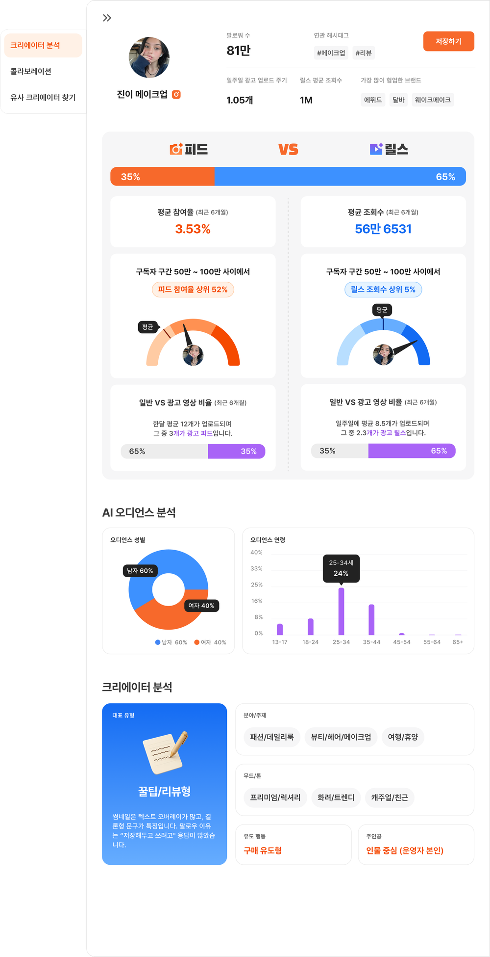 - 콘텐츠 분석피드/릴스 비중, 포맷별 조회수·참여율, 일반 콘텐츠 vs 광고 콘텐츠 비율을 한눈에 확인