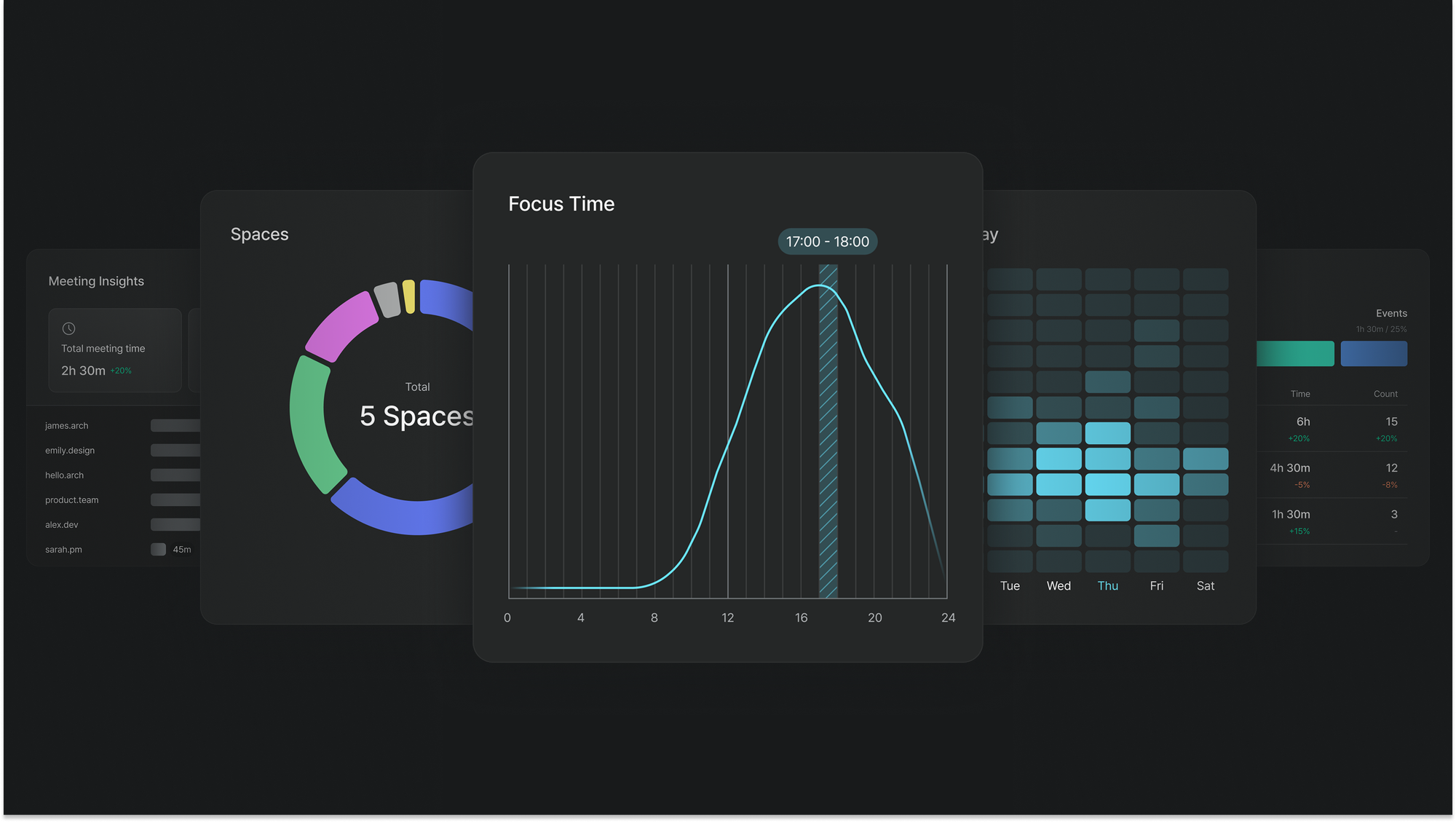 일주일간 아치 캘린더를 사용한 후, 아치 캘린더의 Analytics 페이지를 열어보세요. '집중 시간' 차트는 내가 실제로 가장 활발하게 일한 시간대를 선 그래프로 보여주고, '가장 집중한 날' 히트맵은 요일과 시간대별 집중 패턴을 한눈에 파악하게 해줍니다. 자신이 어떤 크로노타입인지 막연하게 느끼고 있다면, 내 캘린더 데이터가 이미 그 답을 가지고 있을지 모릅니다. '미팅 인사이트'도 함께 보면 얼마나 많은 피크 타임이 회의로 소비되고 있는지 확인할 수 있어요.