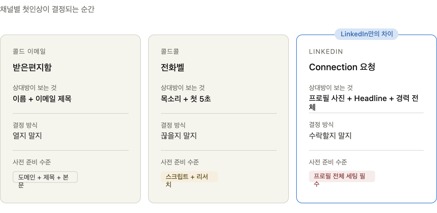 콜드 이메일은 받는 사람이 보낸 사람의 이름과 제목만 보고 열지 말지를 결정합니다. 콜드콜은 전화를 받는 순간 목소리가 첫 인상입니다. 상대방이 내 프로필 사진을 보거나, 내 배경을 확인하거나, 내가 어떤 사람인지를 미리 탐색할 방법이 없습니다.