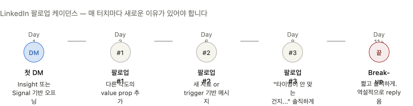 셋째, Accept 이후 첫 DM이 진짜 승부처입니다. 300자짜리 연결 요청 메시지에 공을 들이기보다, 연결 이후 첫 메시지를 어떻게 열 것인지를 더 고민하는 게 맞습니다.