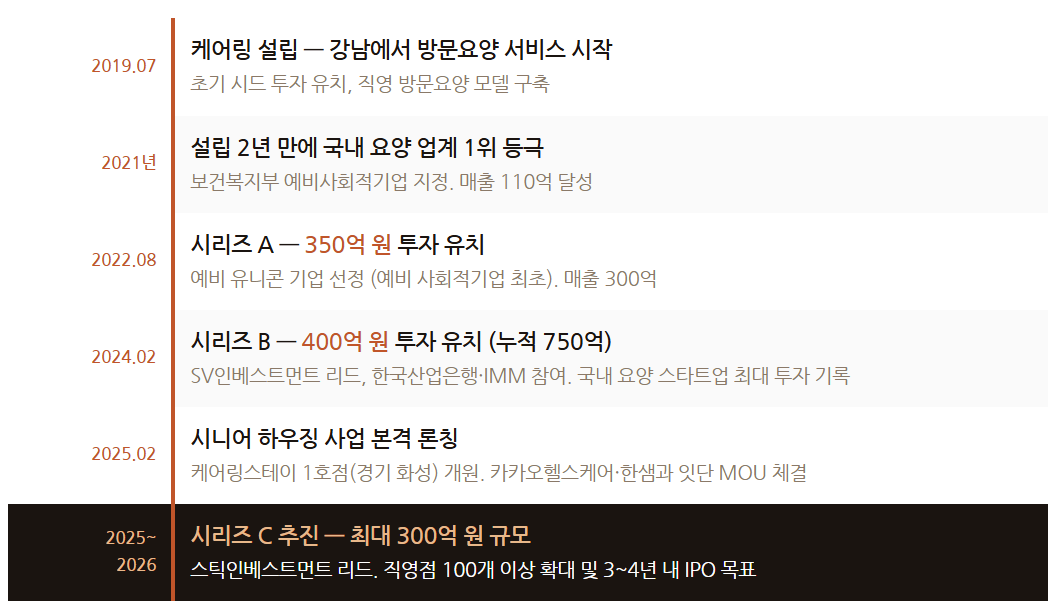 불황기에도 후속 투자가 끊이지 않는다는 사실은, 케어링의 비즈니스 모델이 그만큼 검증됐다는 신호입니다. 보건복지부가 지정한 '예비사회적기업'이자, 예비사회적기업 최초의 '예비 유니콘' 기업이라는 타이틀도 함께 달고 있습니다.