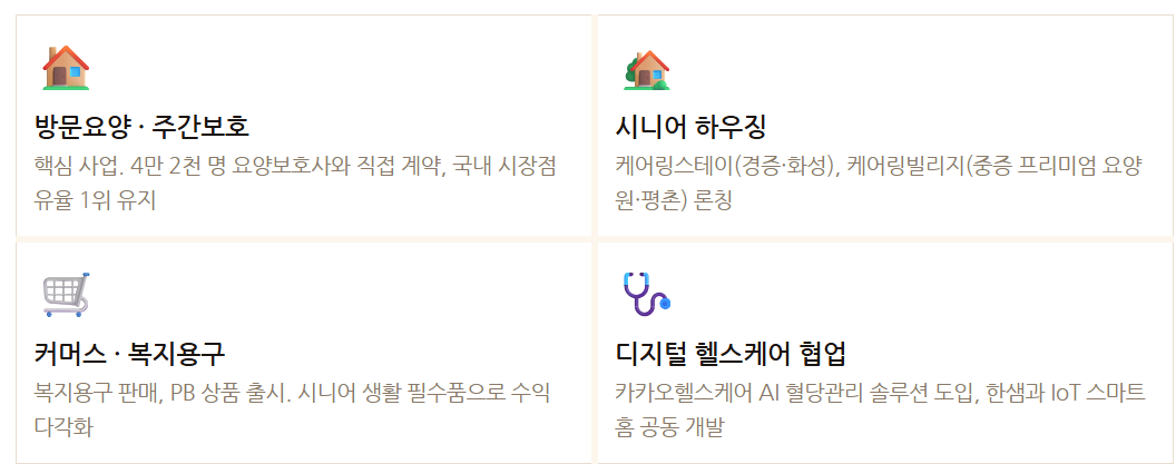 케어링은 방문요양에 머물지 않고 주거·커머스·헬스케어로 수직 통합하고 있습니다. 시니어 한 명당 접점을 늘릴수록 플랫폼의 가치는 기하급수적으로 커집니다. 아마존이 쇼핑에서 클라우드로 확장했듯, 케어링은 요양에서 시니어 라이프 전체로 확장합니다.
