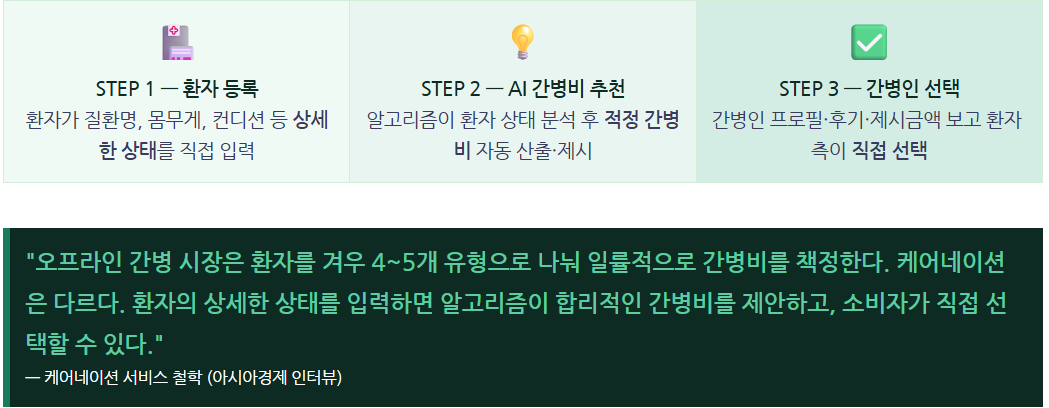 케어네이션이 증명한 것은 간단합니다. 불투명하고 불합리한 시장일수록, 데이터와 기술로 투명하게 만드는 기업이 이긴다는 것입니다. 10조 원 규모의 간병 시장에서 55만 회원과 24만 간병인을 모은 것은 단순한 마케팅의 결과가 아닙니다.
