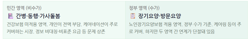 핵심은 이겁니다. 현실에서 환자와 어르신은 두 영역을 동시에 필요로 합니다. 입원 시 민간 간병인이 필요하고, 퇴원 후 장기요양 서비스가 연계돼야 합니다. 그런데 두 영역 사이에는 지금도 '단절'이 있습니다.