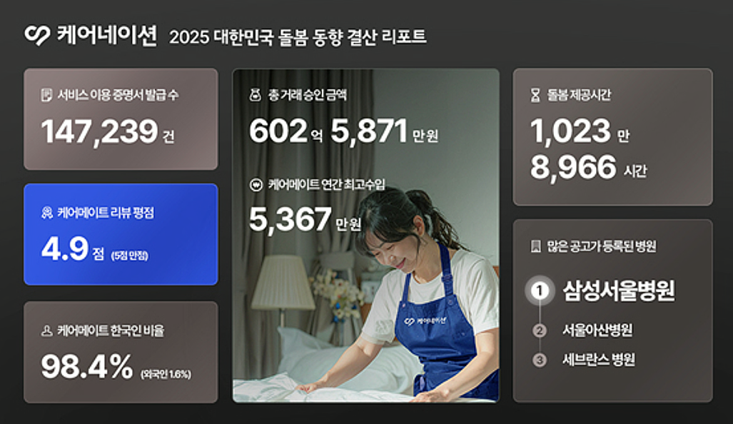 케어네이션은 이 구조적 비효율을 정면 돌파했습니다. 수도권에 집중됐던 간병인 공급을 전국으로 확산시키고, 환자·보호자·간병인 삼자 간의 정보 비대칭을 투명한 플랫폼으로 해소했습니다. 등록 간병인 24만 명 중 98%가 내국인이며, 이 중 상당수가 중장년층 여성으로 새로운 일자리 대안으로 자리 잡고 있습니다.