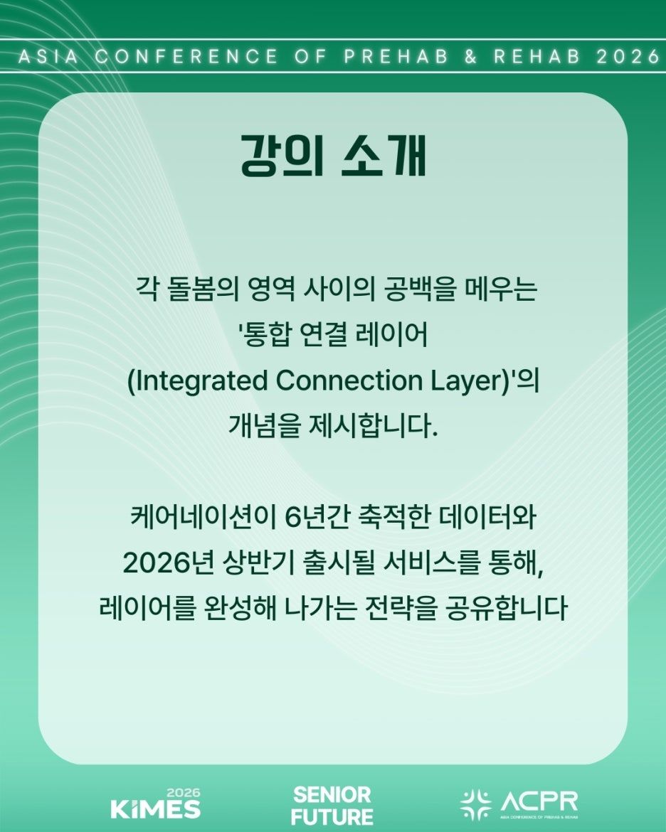 케어네이션이 KIMES 2026에서 제시한 '통합 연결 레이어'는 이 단절을 데이터와 플랫폼으로 메우는 전략입니다. 케어네이션이 6년간 축적한 돌봄 빅데이터와 2026년 상반기 출시될 신규 서비스를 통해 민간-정부 두 영역을 잇는 통합 레이어를 완성해 나가겠다는 선언입니다.