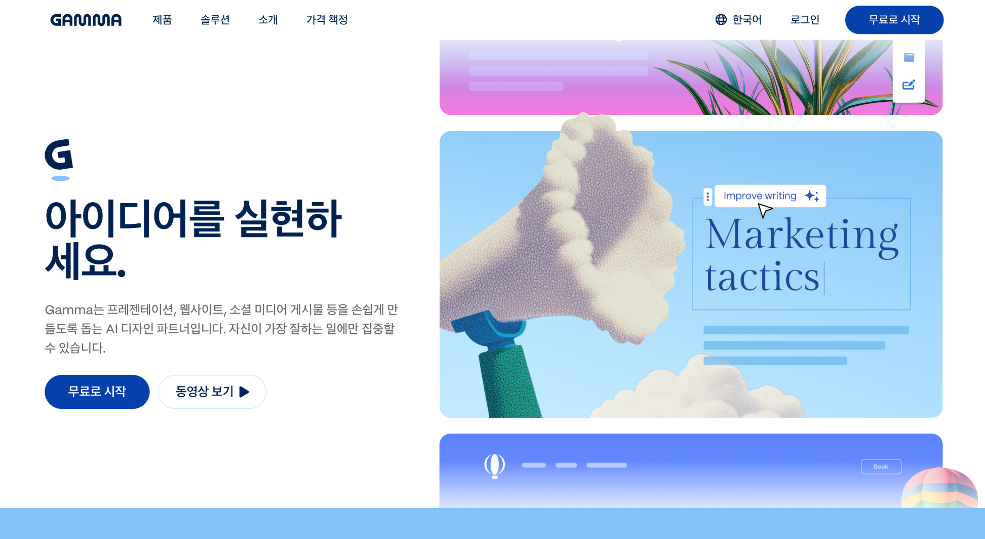 PPT ์์ ์ ๋นํจ์จ์ ์์ ๋ฉฐ, ์์ด๋์ด ์์ฒด์ ๋ ๊ณจ๋ชฐํ ์ ์๊ฒ ๋์์ฃผ๋ Gamma๋ ์ด์ '์์ด๋์ด๊ฐ ์ฆ์ ํผ๋ธ๋ฆฌ์ฑ'๋๋ ์น์ฌ์ดํธยท๋ฌธ์ ์์ฑ์ผ๋ก ํ์ฅํ๋ฉฐ, 'AI ํผ๋ธ๋ฆฌ์ฑ OS'๋ก ์๋ฆฌ ์ก๋ ๋ฐ ์ด์ ์ ๋ง์ถ๊ณ ์์ต๋๋ค.