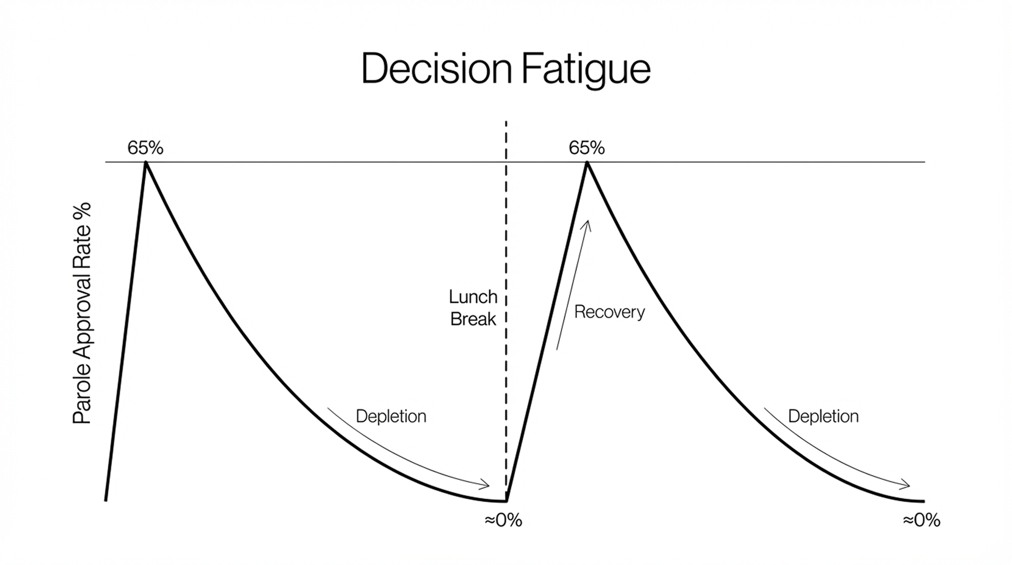 이를 가장 극적으로 보여주는 연구가 있습니다. 미국의 판사들을 대상으로 1,100건 이상의 가석방 결정을 분석한 연구에서, 오전에는 가석방 승인율이 65%였지만 오후로 갈수록 거의 0%까지 떨어졌습니다. 그리고 식사 후에 다시 65%로 회복됐습니다. 판사들의 전문성이나 도덕성의 문제가 아니었습니다. 단지 결정을 많이 내릴수록 뇌가 지쳤고, 지친 뇌는 현상 유지를 선택한 것입니다.